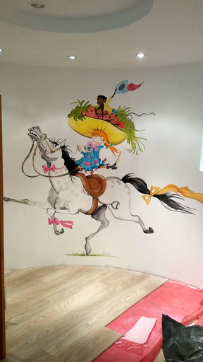 Als alles rond is, kunnen we een datum plannen en kan ik bij je aan de slag.Met mijn kist vol verf en penselen, sheets, projector, verlichting en evt. trap kom ik naar je toe.Met een projector teken ik de afbeeldingen op de muur, dit scheelt heel wat tijd.Als ik eenmaal de lijnen op de muur heb getekend, kan het schilderwerkgaan beginnen.